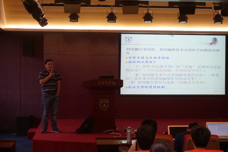 当讲到单次减数分裂重组与突变的直接检验、与有丝分裂对比时,杨教授从经典的模式生物酵母、拟南芥、水稻出发,以丰富直观的示意图,展现了实验的思路与背后的原理。同学们在在这个部分尤为积极,身边不少同学不由地在纸上绘画谱图、推导原理。随后,杨教授提出了重组与突变趋势一致性的猜测,让大家把目光聚焦到当下尚无良策的癌症问题上。杨教授介绍道,从癌症基因组的角度,我们或将进入“精准肿瘤学”的时代,最终逐步攻克癌症难题,然而回归当下,针对水稻我们尚有106个功能未知的基因,对于复杂的人类基因组,更是路漫漫其修远兮。