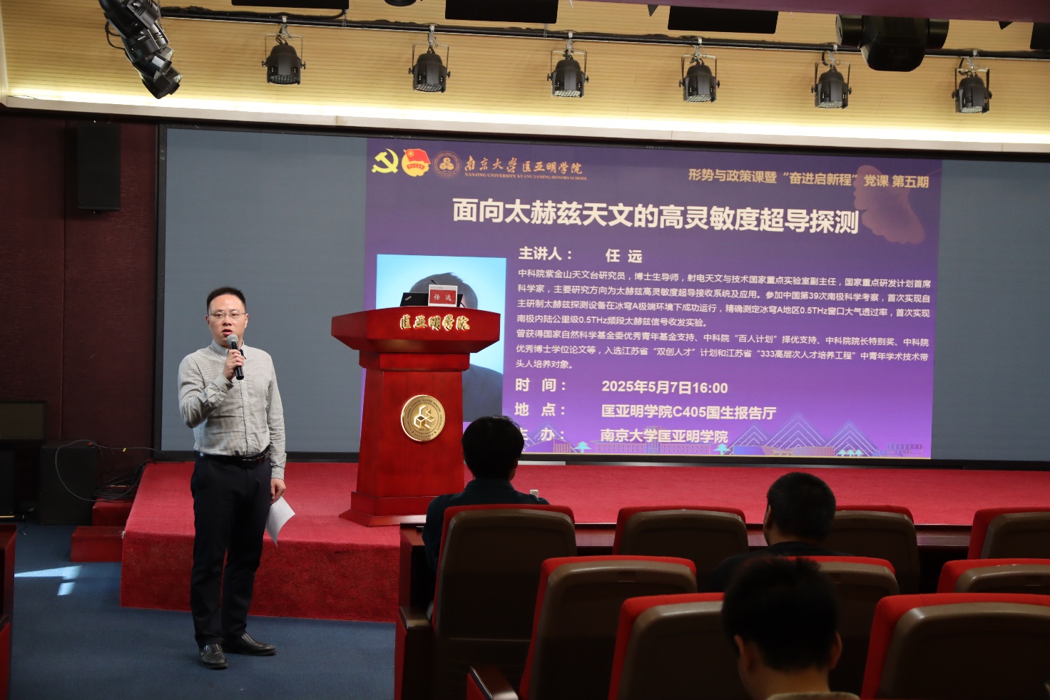 5月7日下午,匡亚明学院举办形势与政策课暨“奋进启新程”党课。本次课程邀请到中国科学院紫金山天文台任远研究员,做题为“面向太赫兹天文的高灵敏度超导探测”的专题报告。匡亚明学院院长助理邹大维以及200余名同学参加报告。报告由匡亚明学院党委副书记周安主持。