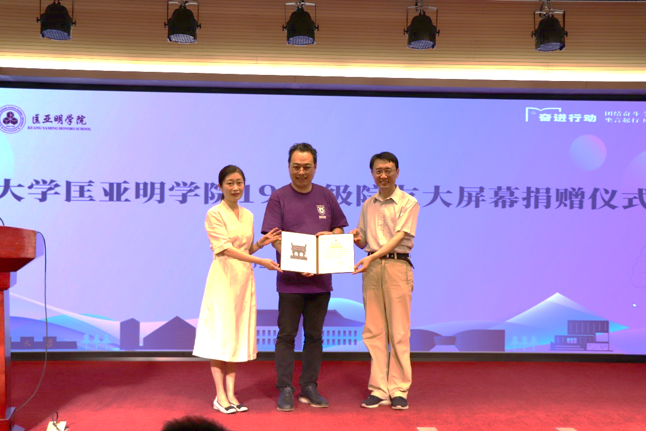 6月22日上午,南京大学匡亚明学院1990级院友大屏幕捐赠仪式在仙林校区举行。本科生院常务副院长、新生学院执行院长、匡亚明学院院长王骏,南京大学校友事务与发展工作处副处长方嘉,匡亚明学院1990级院友、南大智慧城市规划设计股份有限公司总经理洪浩等十余位院友参加活动,共同代表1990级院友向学院捐赠大屏幕。捐赠仪式由匡亚明学院党委书记周媛主持。