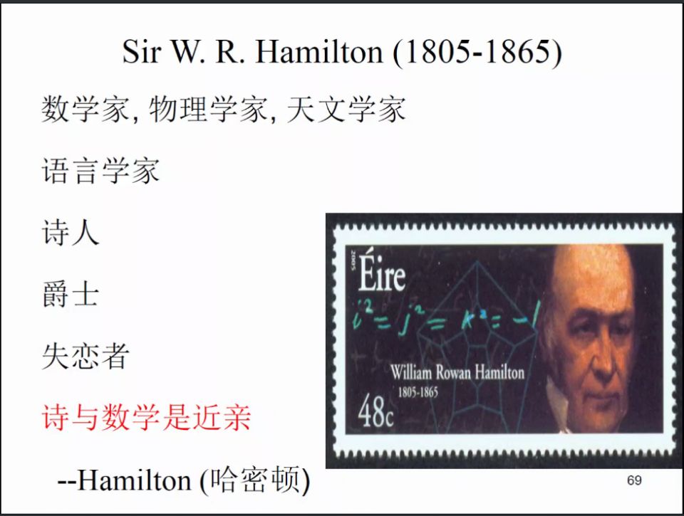 首先,骆教授引入了集合分划和等价关系的概念,然后介绍了Peano曲线和Stirling公式。接着,他介绍了从自然数到整数到有理数、无理数、实数、复数的发展。一位意大利文艺复习时期百科全书式的学者G. Cardano是一位在这期间非常重要的人物。从实数域到复数域,仿佛是进入了一个全新的天地,得到了很多很多,但也失去了秩序。爱尔兰数学家Hamilton花了八年时间寻找三元数无果,后来发现了四元数。这是一位不仅是一位数学家、物理学家、天文学家,还是一位语言学家、诗人、爵士,失恋者,他认为诗与数学是近亲。