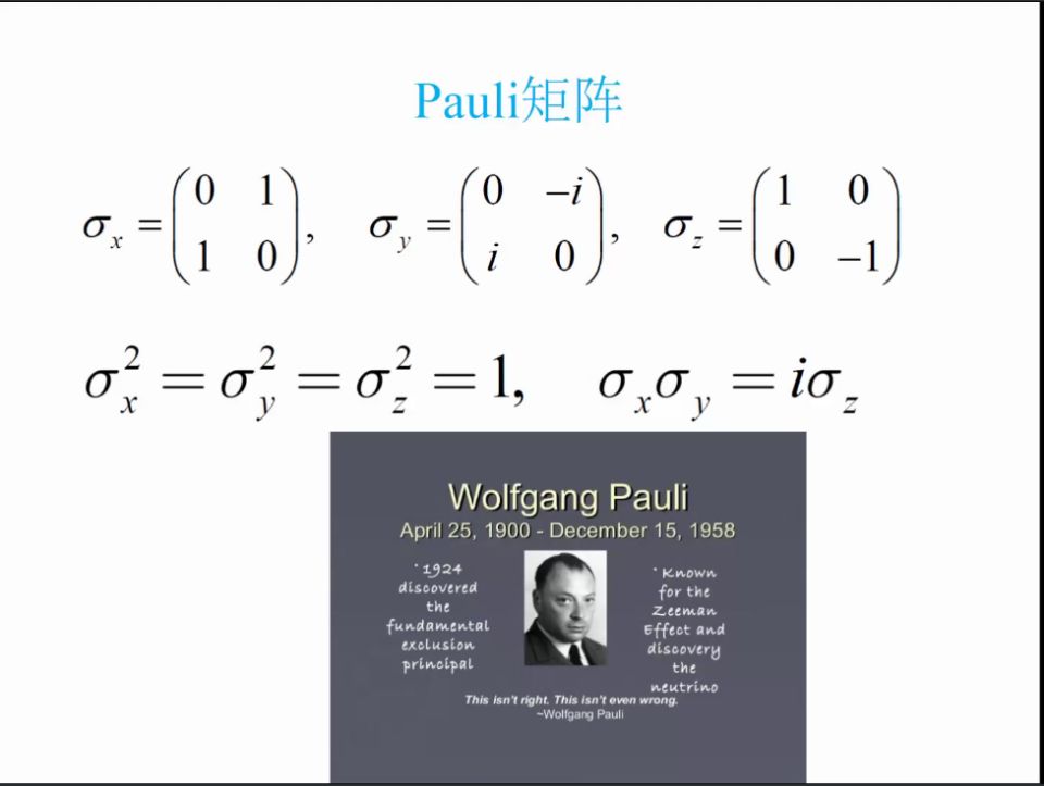 然后,骆教授介绍了八元数以及张量的概念,并由此进入了量子力学。他提出量子是由矩阵(算子)来描述,并介绍了Pauli矩阵、Gell-Mann矩阵、Dirac矩阵以及交换子。然后,他解释了为什么基本粒子的分类来源于矩阵群表示。在不断地进行数系扩张以后,我们就达到了一个神奇的量子世界(算子世界)。