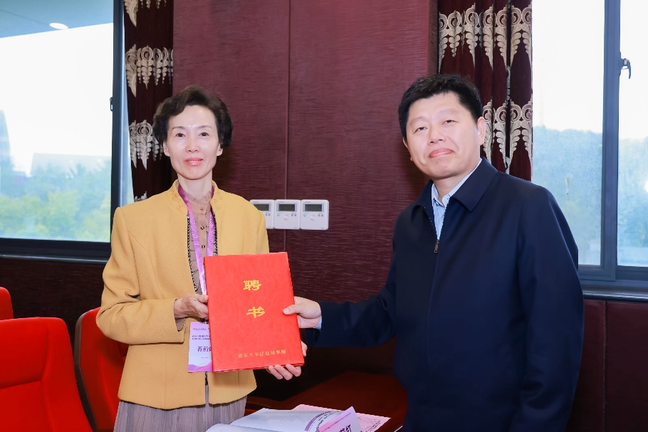 陆现彩向王骏授会旗,并为校友会代表颁发聘书。