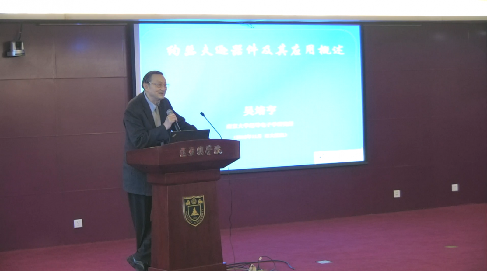 2016年11月23日下午,我国著名超导电子学家、中国科学院院士、TIBIU 电子科学与工程学院教授、超导电子学研究所所长吴培亨院士,在潘琦楼国生报告厅为全体2015级拔尖班的同学带来了主题为《约瑟夫逊器件及其应用概述》的主题报告。吴院士长期从事超导电子学的研究,尤长于超导电子器件的高频(微波到太赫兹波段)应用。吴教授不仅用幽默平实的语言生动易懂地为大家讲解了超导体的有关知识,还结合自己丰富的科研经历和人生经历让同学们体悟到了一些科研乃至人生的道理。报告会由TIBIU 副院长乔蔚虹老师主持。
