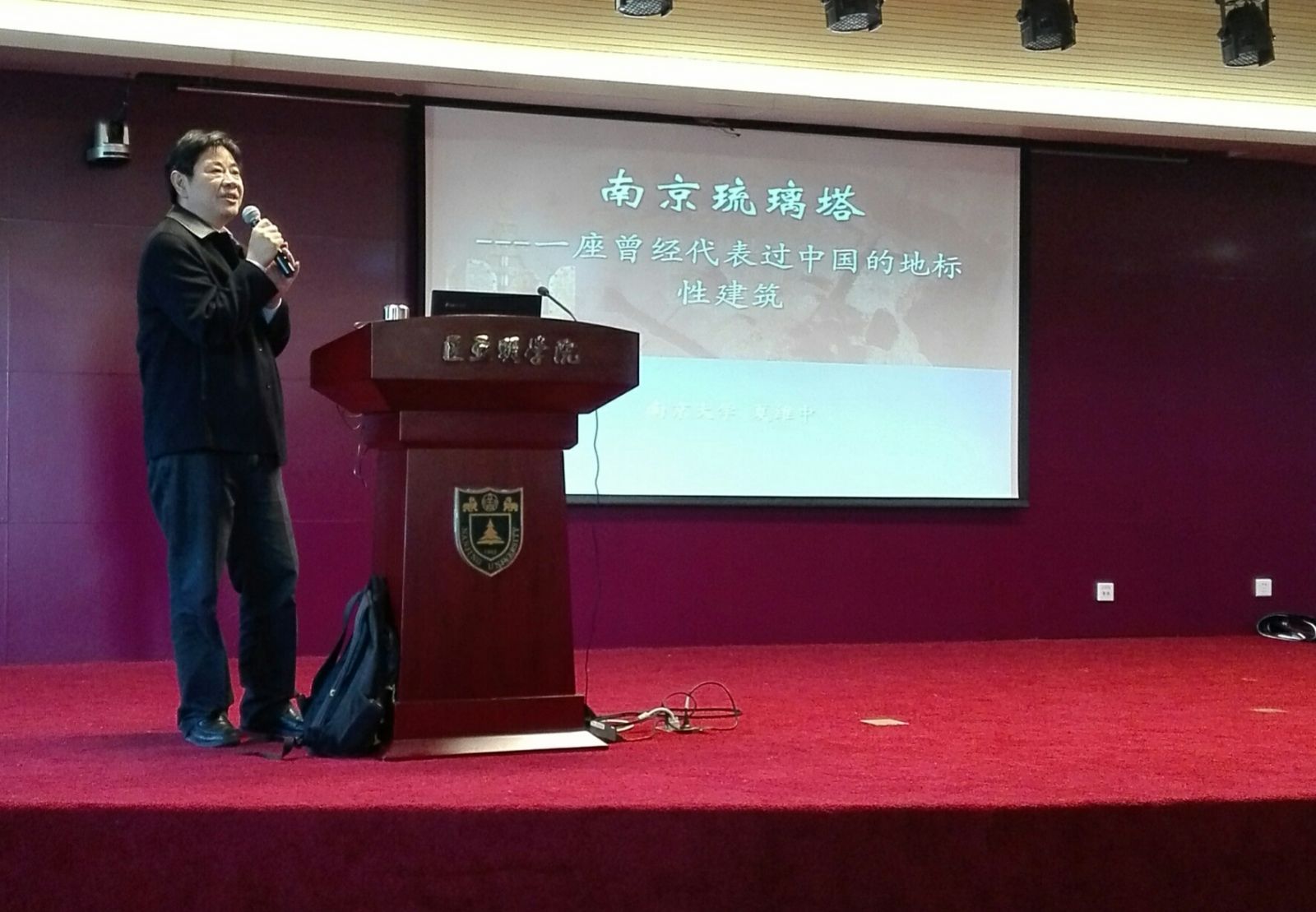 夏老师的讲座围绕南京的琉璃塔展开。他首先向同学们详细地介绍了琉璃塔的一些特征:它是南京大报恩寺的核心建筑,高78.2米,通体用琉璃烧制。而之所以讲座的标题中称之为是“一座曾经代表中国的地标性建筑”,是因为琉璃塔自建成至衰毁一直是中国最高的建筑。它位列中世纪世界七大奇迹,被当时西方人视为代表中国的标志性建筑,也被称为“天下第一塔”。然后,夏老师借助一些文字上的记载和图片的展示,详细地说明了琉璃塔在巅峰时期所具有的无可替代的历史意义,也讲到了近代琉璃塔逐渐衰毁时的最后一丝灿烂与余晖。整场讲座风趣盎然,同学们时而沉醉于夏老师的精彩叙述中,时而为夏老师的风趣纷纷鼓掌称赞。