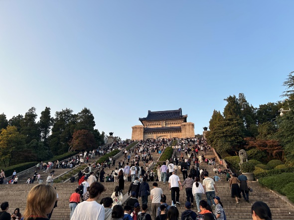 11月2日,元培学院师生与南大匡院的志愿者们一起游览了南京博物馆、中山陵及梧桐大道等南京的标志性景点。在南京博物馆,留学生们不仅欣赏了珍贵的历史文物,还进一步了解了南京作为“六朝古都”的丰富历史。在中山陵,志愿者们讲解了孙中山先生的生平及其对中国现代化的伟大贡献,留学生们纷纷表示震撼,并对南京的厚重历史有了更深的体会。