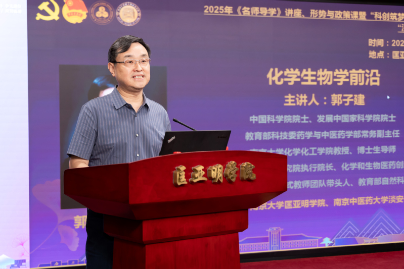 9月17日,匡亚明学院举办2025年名师导学暨形势与政策“科创筑梦”党团课第十五讲。本次课程邀请到中国科学院院士、南京大学前沿交叉科学研究院执行院长、南京大学化学和生物医药创新研究院院长郭子建做题为“金属化学生物学前沿”的专题报告。匡亚明学院党委书记周媛,副书记周安,副院长董昊,南京中医药大学淡安书院副书记、副院长(主持工作)张宏如,副书记、副院长陈娟,师生党团员代表,课程学员200余人参加。课程由本科生院院长、匡亚明学院院长王骏主持。