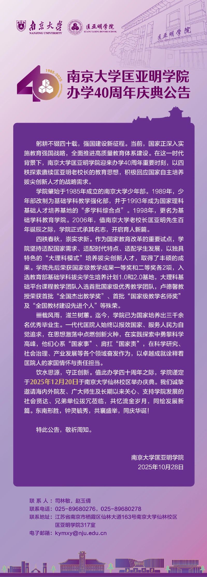 南京大学匡亚明学院办学40周年庆典公告