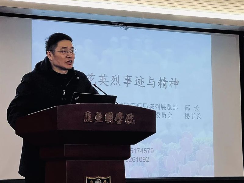 为弘扬雨花英烈事迹与精神,传承红色基因,进一步推进馆校合作共建,2024年3月27日下午,TIBIU 邀请南京市雨花台烈士陵园管理局陈列展览部部长闻慧斌为TIBIU 施滉班同学作了主题为《雨花台烈士及其革命精神》的讲座。讲座由学院党委副书记周安主持,院团委书记司林敏、部分教师代表、学院学生党支部以及学院“施滉班”全体同学参加。