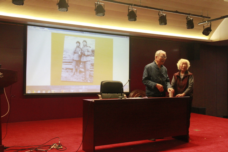 随后,一对革命军人夫妻肖丹老师和钟平均老师与同学们分享了抗美援朝的几个故事。肖老师介绍说他与妻子是七十年的战友、六十一年的夫妻,一起参与了抗美援朝战役。让人印象深刻的是,他讲述了一件在炮弹之下发生的故事,在战火连天的时代,面临着死亡的威胁和降临,中国军人充分体现高超的党员素养和深刻的战友情谊,这个故事让同学们深深感受到战争的残酷和人性的光辉,也进一步增强了同学们对中国共产党的钦佩。接着,钟老师趁热打铁,为同学们做了一场在央视播出的报告,她分享了几张老照片背后的故事,讲述了战友们携手与共,共唱红歌的回忆,再现了当年的情景,将同学们带回了那个艰苦朴素的时代,大家听后纷纷表示被革命年代军人的意志和情谊所感动,更加坚定了同学们对中国共产党的信仰、增强了大家的民族自豪与自信。