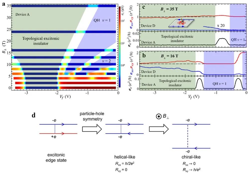 图1(左)在电子-空穴密度不平衡的双层量子阱中形成的moat 能带。(右)双层量子阱激子系统中的完整相图。凝聚态物理中,电子和空穴可以发生配对,产生等效的玻色子,即激子,而InAs/GaSb反转型量子阱可以提供研究激子基态的可控平台。该工作研究了电子-空穴耦合的双层系统,发现当电子和空穴浓度不平衡时,系统所产生的激子具有moat型能带(如图1左所示)。强阻挫效应使得激子不发生玻色凝聚,进而产生一类具有长程量子纠缠的激子拓扑序(excitonic topological order),其物理图像等价于激子形成的分数量子霍尔态。考虑到阻挫效应导致的量子涨落之后,系统的完整相图如图1右所示。相比于传统的平均场理论结果,该工作发现量子涨落会导致在激子凝聚相中出现一个新的激子拓扑序区域。在实验上,团队成员发现在电子和空穴浓度很不平衡的门电压区域内(-2V到-3V),激子体态始终保持绝缘且存在着能隙,而在此前的研究中,激子绝缘体一般在电子空穴浓度相近时才出现。 在该区域内,输运测量揭示了体系存在着拓扑边缘态,产生了一个拓扑激子绝缘区,如图2a所示。奇异的是,随着垂直磁场的增加,边缘态输运行为从零磁场下的类螺旋型(helical-like)逐渐转变为类手征型(chiral-like);最终在强磁场下,边缘态电导接近量子化值(如图2b,c)。上述实验现象与传统的霍尔效应截然不同,同时其磁阻行为也区别于量子自旋霍尔效应,无法用目前已知的拓扑物态理解。激子拓扑序可以很好地解释上述实验现象。该拓扑序在电子、空穴浓度不平衡的区间中产生,并具有一对电子-空穴形成的手征边缘态。在零磁场下,电子和空穴携带相反的电荷,产生类螺旋型边态输运。与量子自旋霍尔效应不同,激子拓扑序无需时间反演对称的保护,在垂直磁场下这一对边缘态不会打开能隙,而是在实空间分离,从而导致向类手征型输运转变(如图2d所示)。 上述理论和实验的相互印证揭示了在电子-空穴双层系统中由于阻挫和关联效应所产生的激子拓扑序。