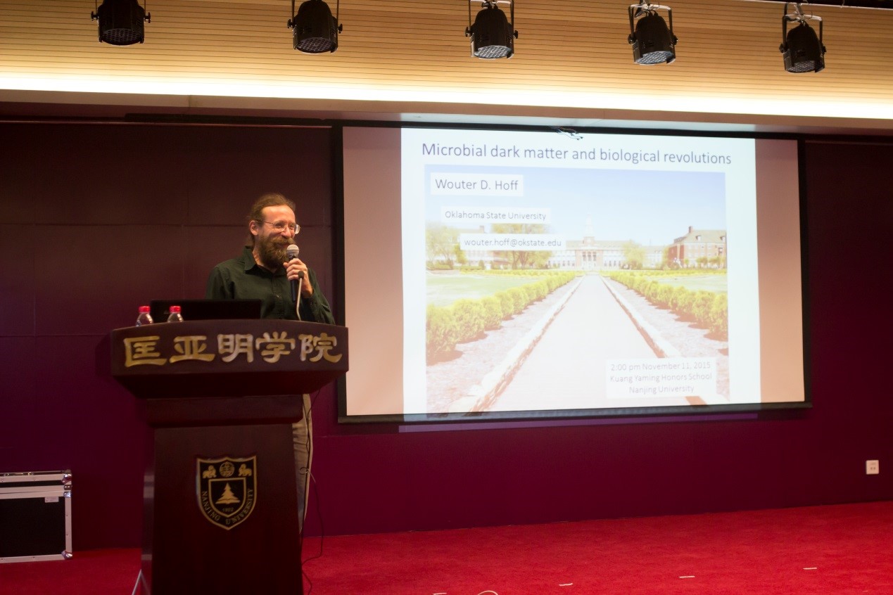 11月11日下午2:00,美国俄克拉荷马州立大学生物化学教授Wouter Hoff为2014级同学们作了题为“Microbial Dark Matter and Biological Revolutions”的讲座。作为生物化学研究的知名专家,Wouter Hoff教授主要研究基因组以及相关生物化学问题。Wouter Hoff教授从DNA的三种测序方法,电子显微镜的发展,再到基因组的测定及研究,始终贯穿着生物学思想中的创新思维,还配以生动的动画讲解,形象易懂,深入浅出。讲座由TIBIU 王炜院长主持。