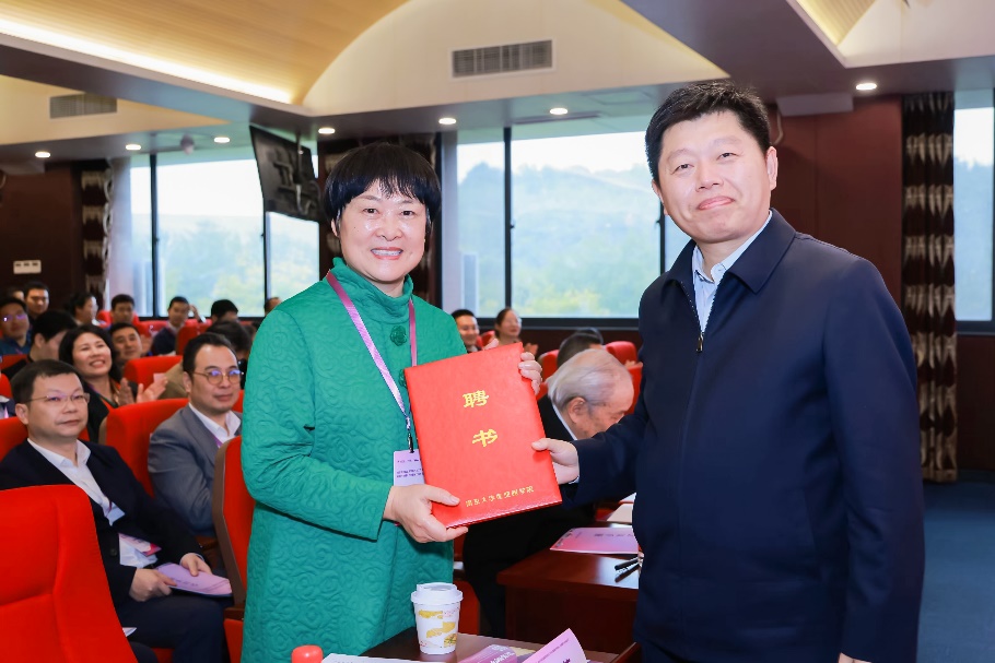 陆现彩向王骏授会旗,并为校友会代表颁发聘书。